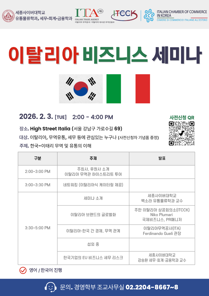 The Italian Chamber of Commerce in Korea (ITCCK) is pleased to announce its participation in the Italian Business Seminar, organized by Sejong Cyber University and dedicated to Italian brands, global distribution, and international market entry strategies.