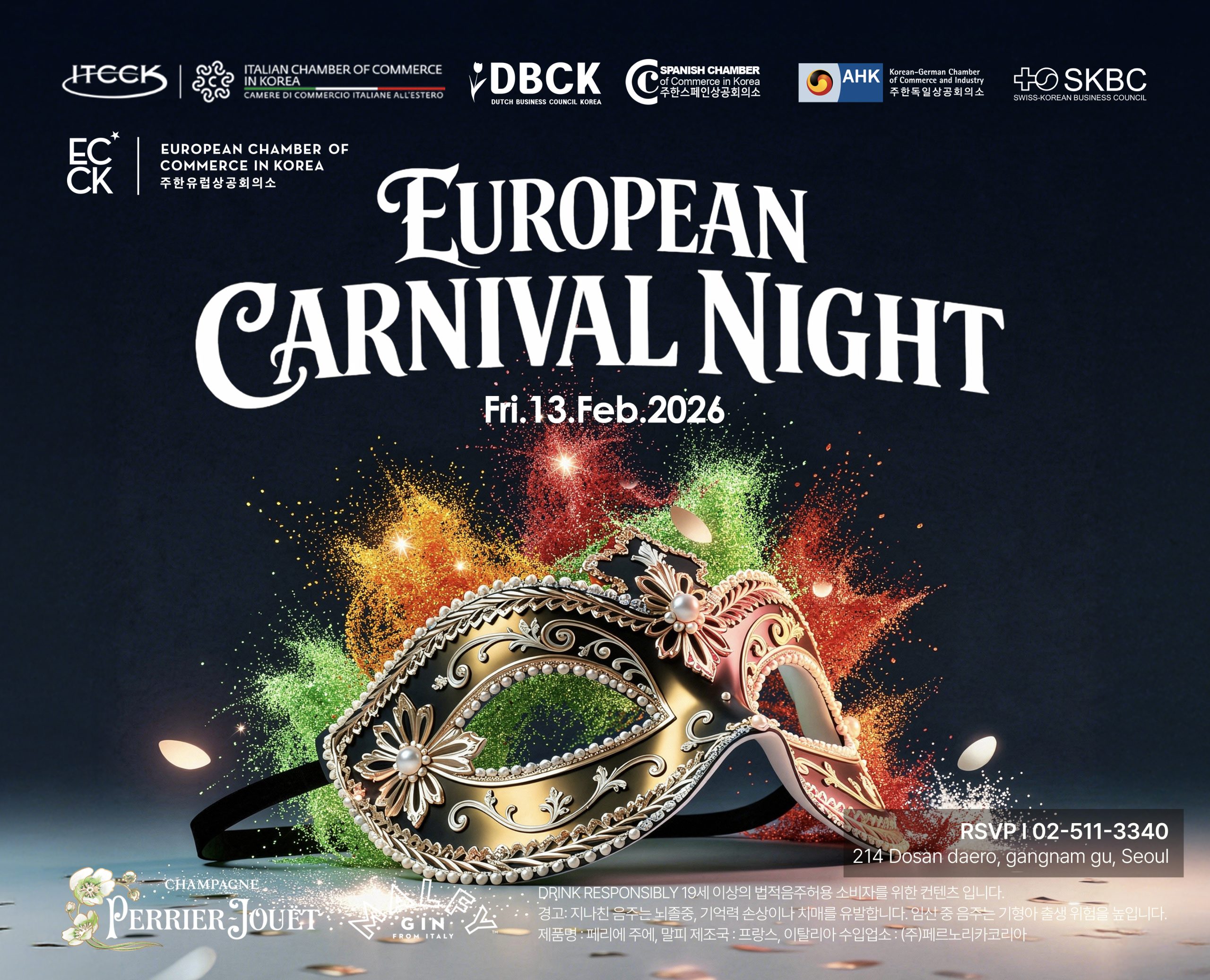 The Italian Chamber of Commerce in Korea (ITCCK), the Dutch Business Council in Korea (DBCK), the Spanish Chamber of Commerce in Korea (ESCCK), the Korean-German Chamber of Commerce and Industry (KGCCI), the Swiss-Korean Business Council (SKBC), and the European Chamber of Commerce in Korea (ECCK) are pleased to invite you to the European Carnival Night 2026.