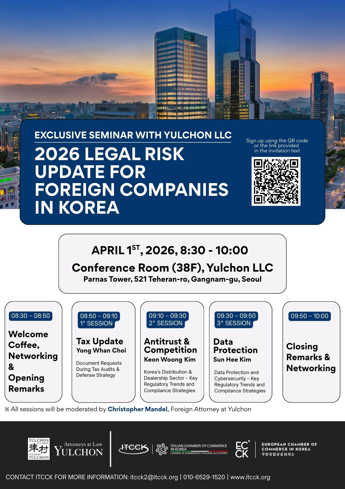 Program Overview08:30 – 08:40 | Welcome Coffee & Networking 08:40 – 08:50 | Opening Remarks by Andrea Verazzi, ITCCK President and ECCK 08:50 – 09:10 | Tax Update – Document Requests During Tax Audits & Defense Strategy + Q&A by Yong Whan Choi, Co-Head of the International Tax Team 09:10 – 09:30 | Antitrust & Competition – Korea’s Distribution & Dealership Sector, Key Regulatory Trends and Compliance Strategies + Q&A by Keon Woong Kim, partner at Yulchon, specialized in antitrust and competition law 09:30 – 09:50 | Data Protection – Data Protection and Cybersecurity, Key Regulatory Trends and Compliance Strategies + Q&A by Sun Hee Kim, Head of the Data & Technology Team 09:50 – 10:00 | Coffee & Further Networking
