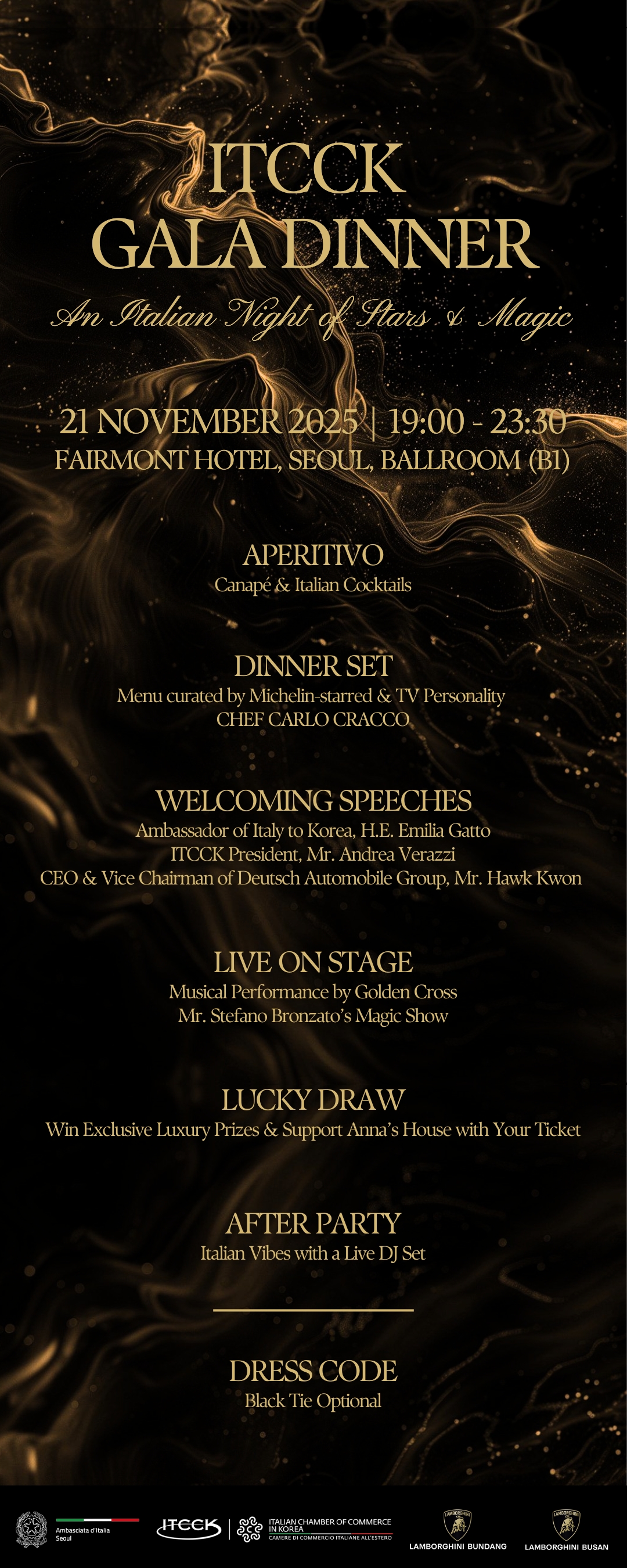 The long-awaited ITCCK Gala Dinner 2025, in collaboration with the Italian Embassy in Korea and sponsored by Lamborghini Bundang-Busan, will take place on Friday, November 21, 2025, at the prestigious Fairmont Ambassador Hotel Seoul.