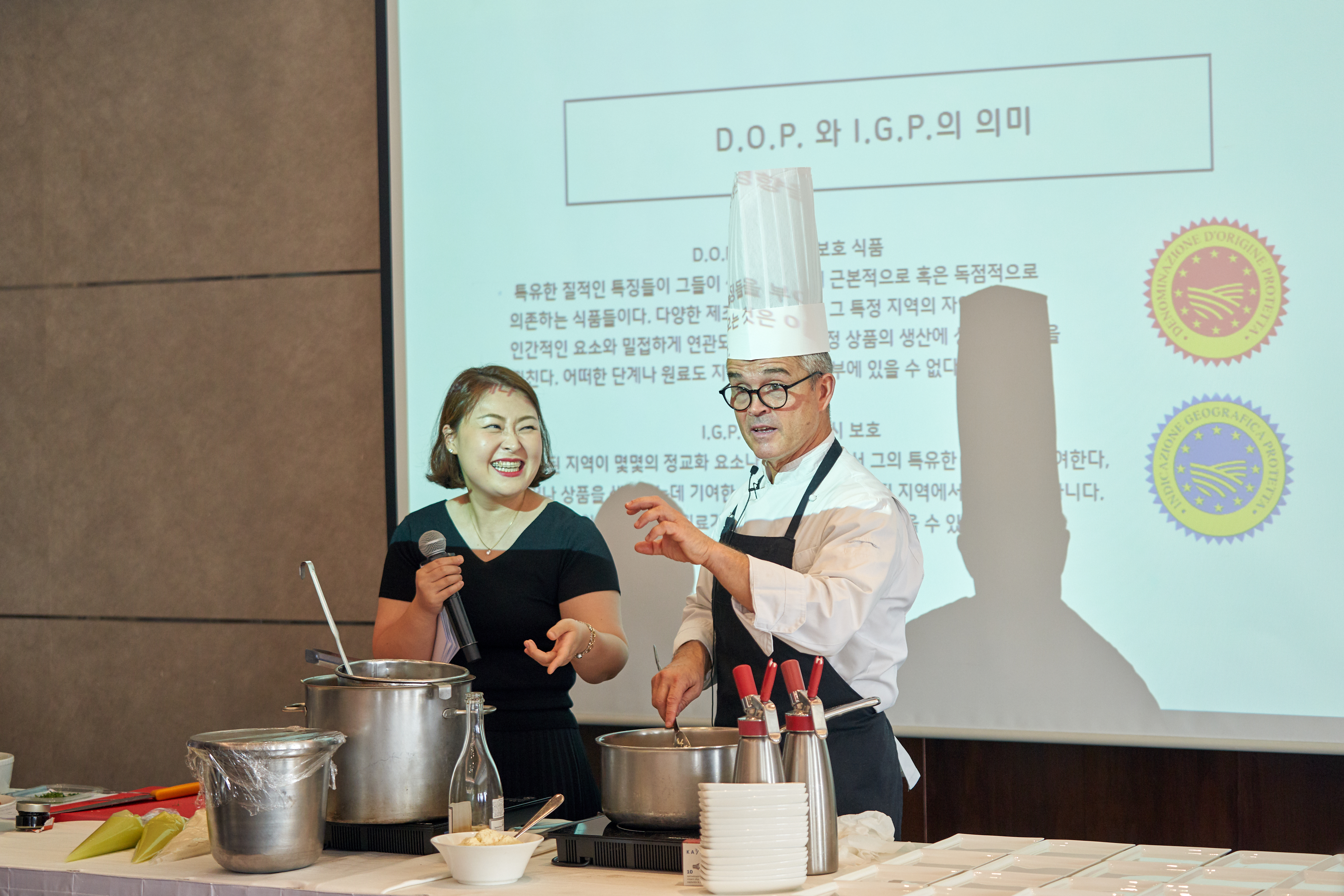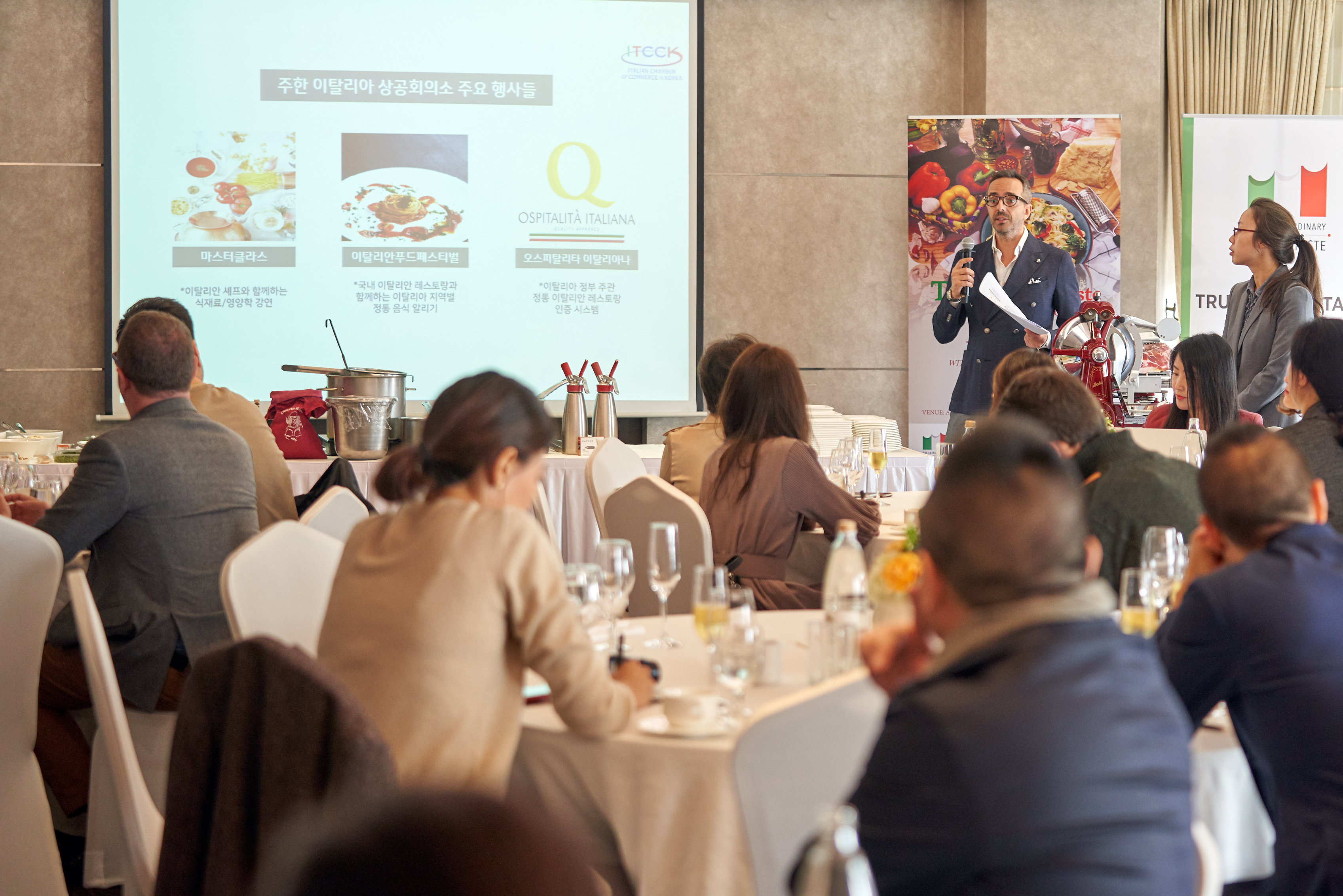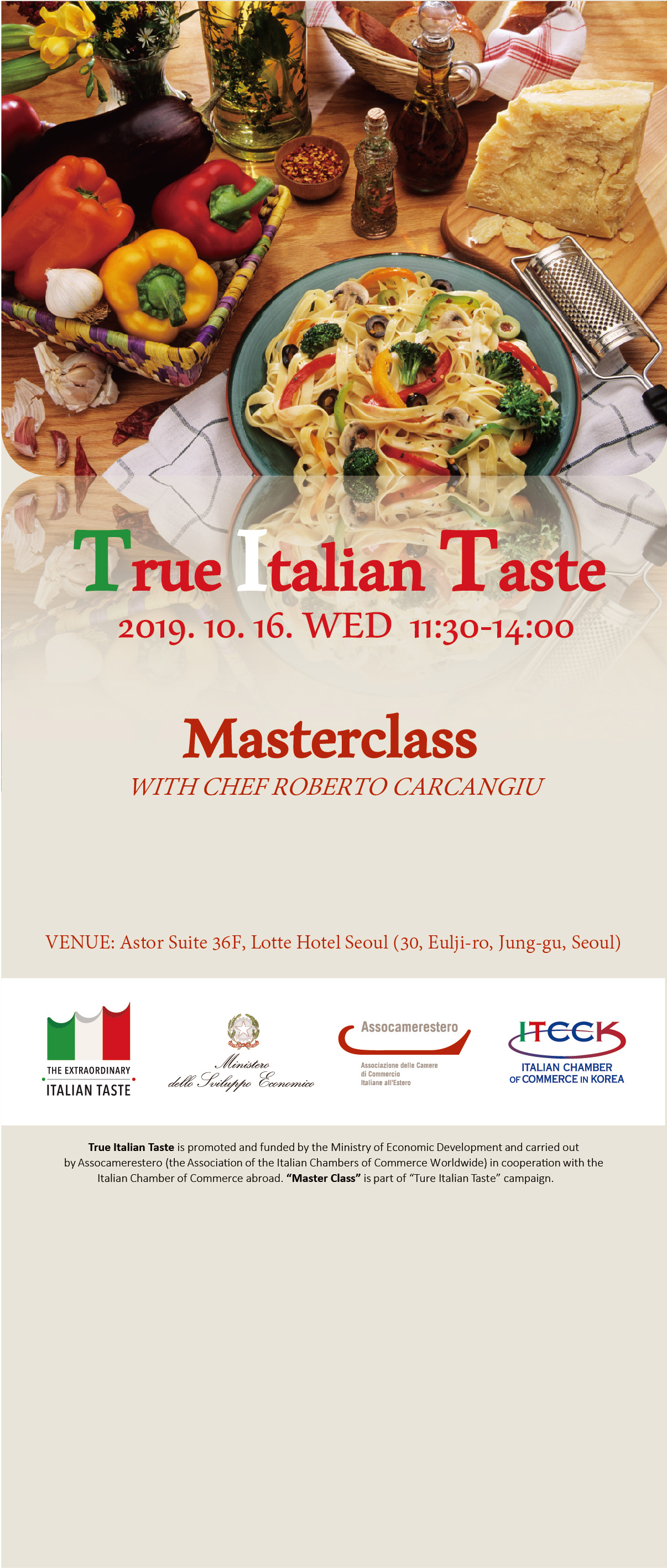 The True Italian Taste Master class successfully took place on October at Lotte Hotel in Seoul. The aim of this event was to support and promote the authentic Italian food products in South Korea, in particular DOP and IGP Products. Our selected number of guests from the F&B sector had the chance to taste high quality Italian raw materials such as 12-24-36 months Parmigiano Reggiano, 6-12-25 years Aceto Balsamico and 24 months Prosciutto di Parma. It was a great opportunity to savor the differences that months or years of maturation can make in the final taste of fine Italian products. The Italian Chef Roberto Carcangiu was invited to illustrate the differences between these DOP and IGP products and to cook live a few typical Italian dishes, which were later served to our guests. A special thanks goes also to the President of ITCCK F&B committee and executive Chef at Lotte Hotel Sebastiano Giangregorio for his continuous support to our organization. The event is part of the project “True Italian Taste” promoted and funded by the Ministry of Economic Development (MISE) and carried out by Assocamerestero, in cooperation with the Italian Chambers abroad. “True Italian Taste” is part of the program “The Extraordinary Italian Taste”