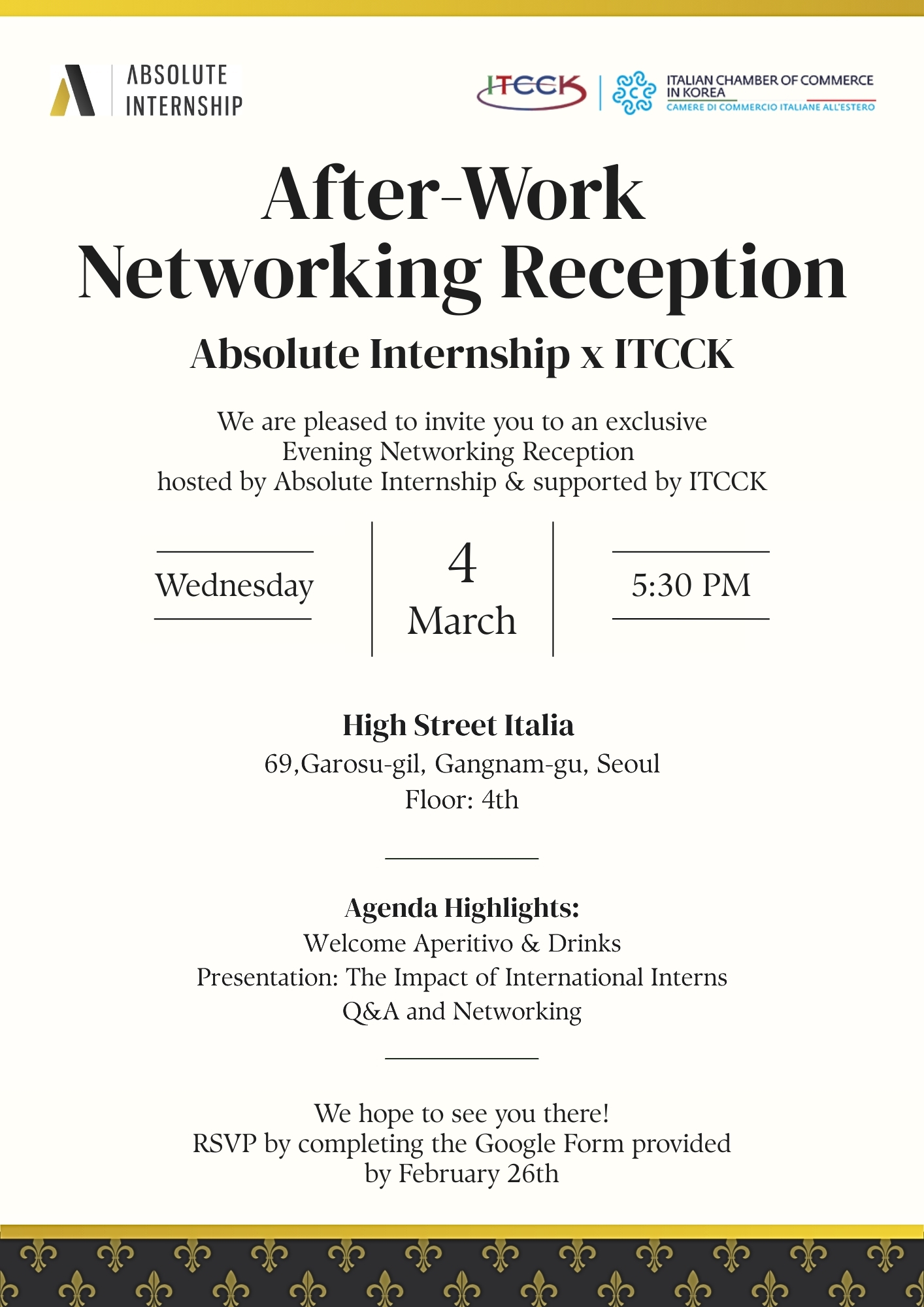 The Italian Chamber of Commerce in Korea (ITCCK) is glad to support an after-work networking reception organized by our Member, Absolute Internship, taking place in Seoul on Wednesday, March 4th.