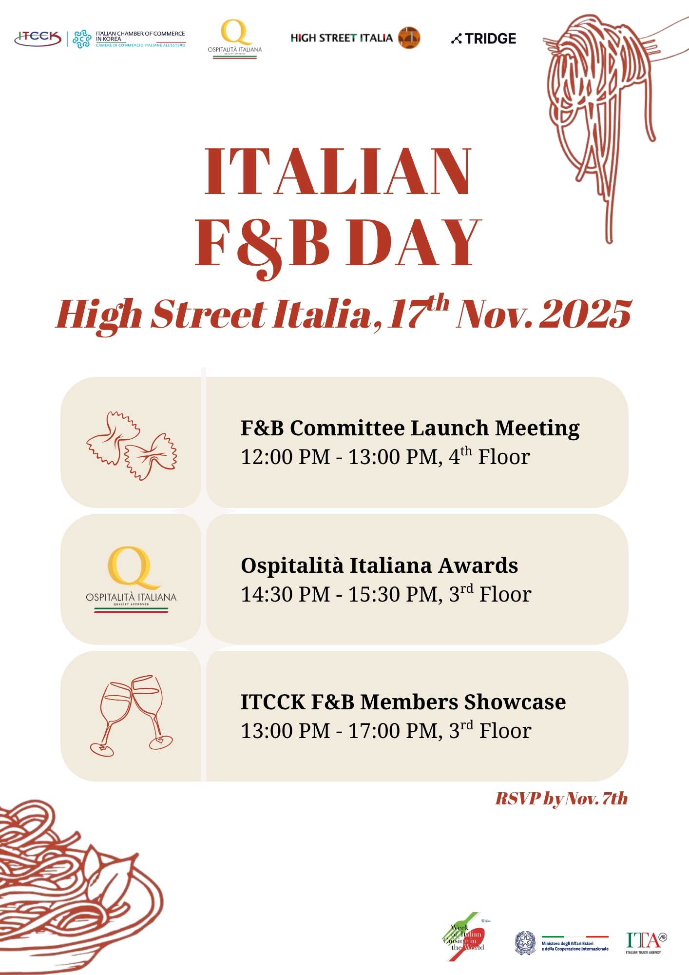 The Italian Chamber of Commerce in Korea (ITCCK) will host Italian F&B Day 2025 on November 17, 2025, at High Street Italia (Seoul) - an event dedicated to promoting the authenticity and quality of Italian food and beverage in the Korean market.