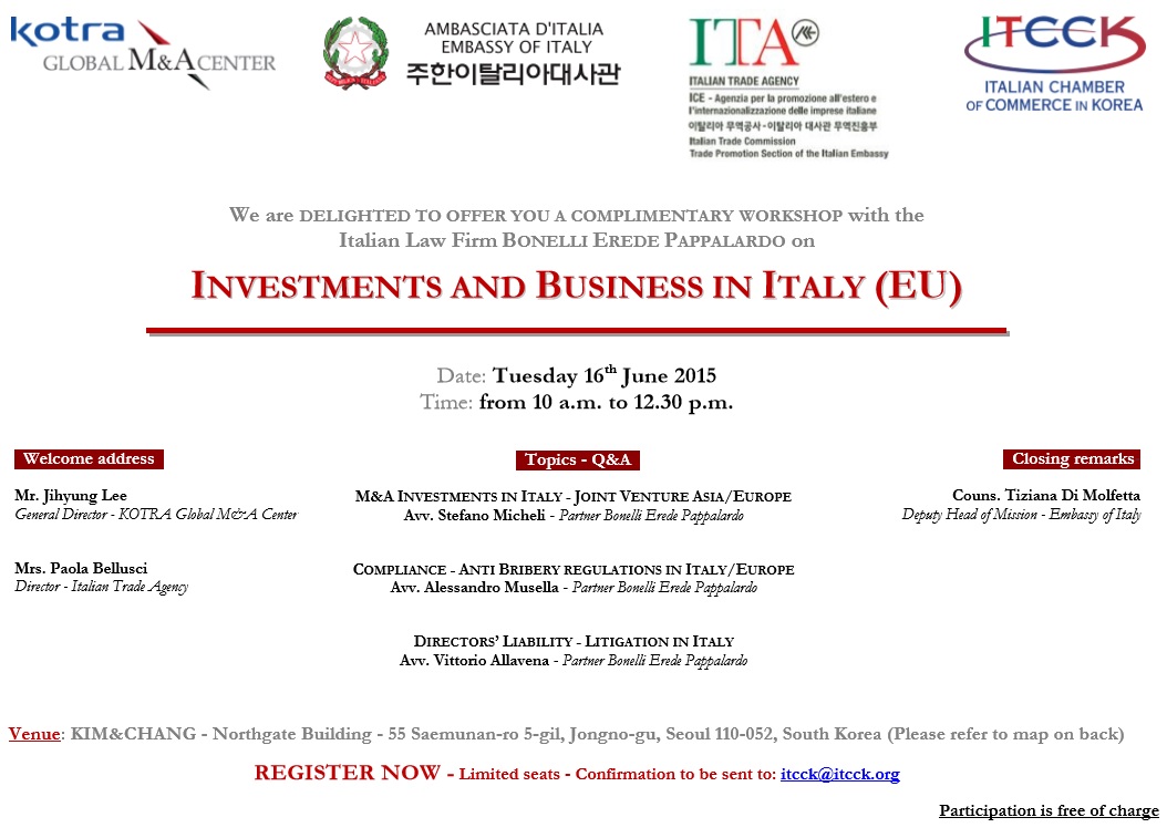 ITCCK - Workshop "Investments and Business in Italy" (Seoul, June 16 2015)