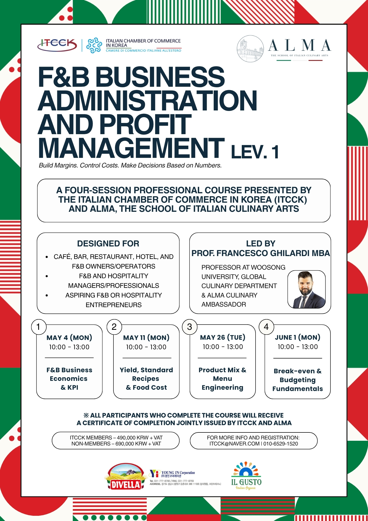 [English version follows] ALMA 협력 F&B 사업 경영 및 수익 관리 교육 프로그램 주한이탈리아상공회의소(ITCCK)는 외식 및 호스피탈리티 경영 역량 강화를 위해 ALMA – The International School of Italian Cuisine–이탈리아 대표 요리학교와 협력하여, Young In Corporation & Il Gusto 스폰서 참여로 특별한 전문 교육 프로그램을 선보입니다.